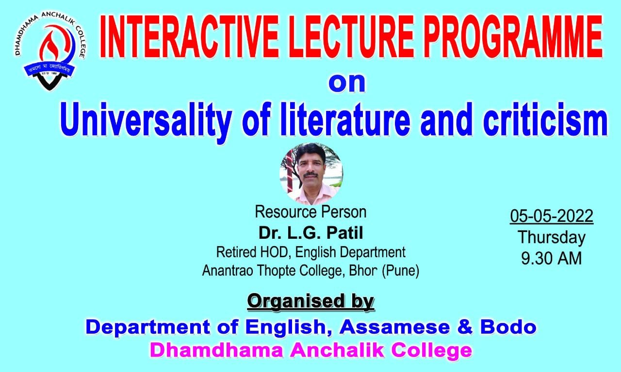 An Interactive Lecture Programme On Universality of Literature and Criticism will be held on 5th May,2022